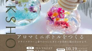 イベント参加予定 10月19日・ワークショップを開催します! 🌿【10月19日 ワークショップ開催のお知らせ】🌿TEA VALLEYさんのプレオープンに合わせて、「アロマミニボトルづくり」のワークショップを開催いたします。ドライフラワーと香りのオイルを自由に組み合わせて、あなただけの癒しのボトルをつく... 2025.10.07 イベント参加予定ハンドメイド